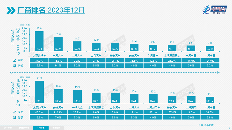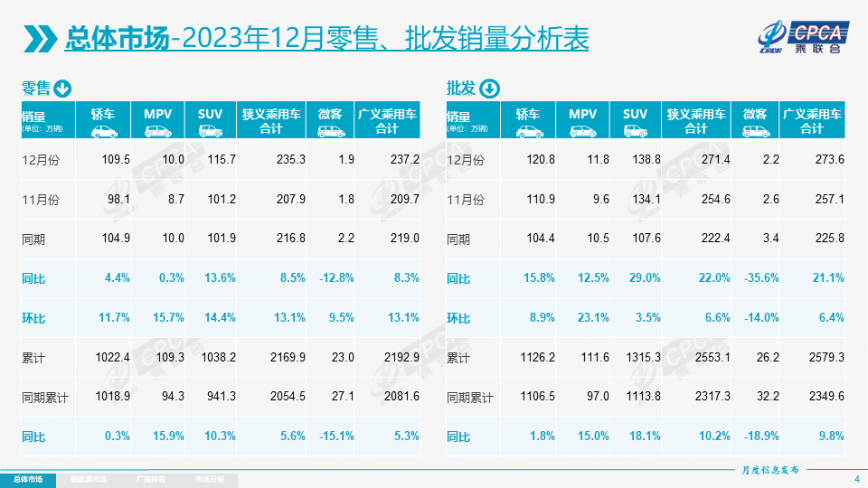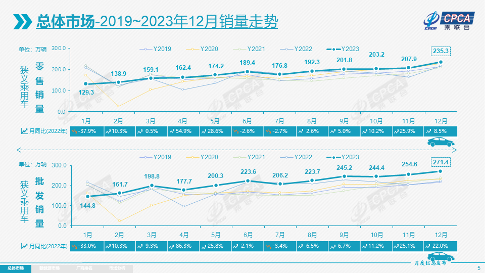 乘联会发布了2023年12月份全国乘用车市场分析,其中指出,2023年12月乘用车市场零售达到235.3万辆,同比增长8.5%,环比增长13.1%。今年以来累计零售2,169.9万辆,同比增长5.6%。